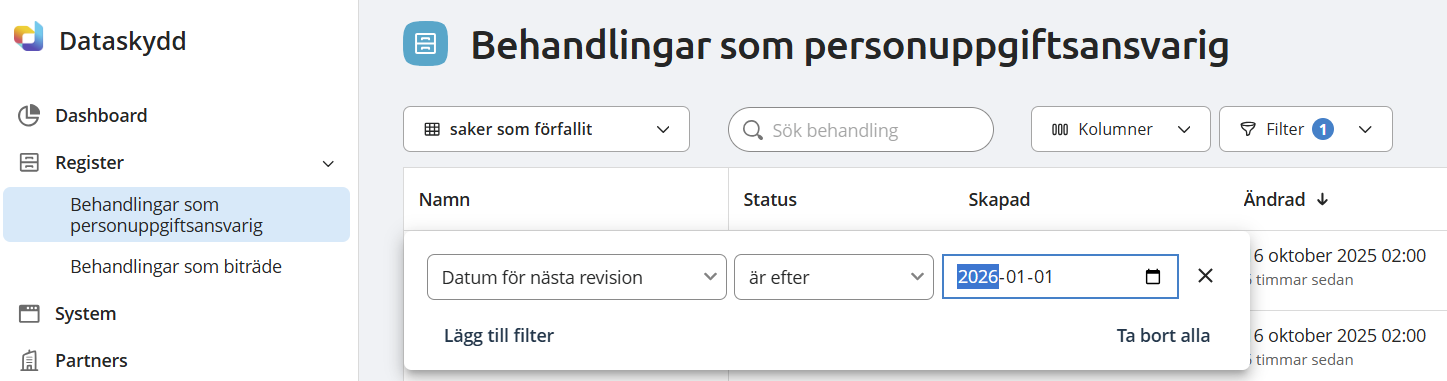 Registret är uppdelat i två huvudvyer baserat på organisationens roll i hanteringen av personuppgifter. Du kan enkelt växla mellan dessa vyer för att se relevanta registreringar.
