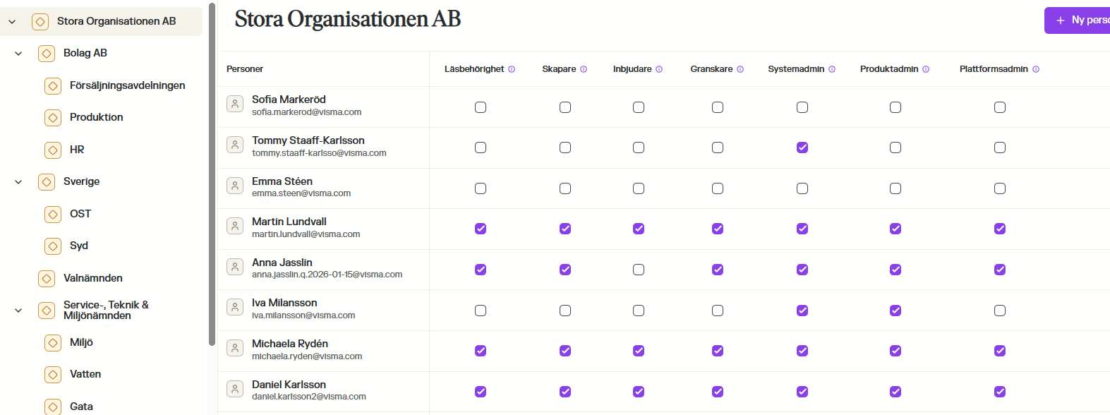 När du navigerar i organisationsträdet under Behörighet per enhet kan du stöta på personer vars behörigheter inte går att klicka ur. Detta beror på att behörigheten är satt på en högre nivå i trädet, en så kallad toppnod.