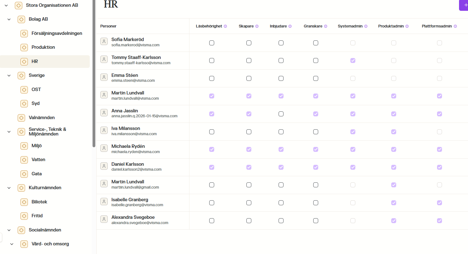 Eftersom lägre nivåer ärver inställningar från de övre, låser systemet dessa val för att säkerställa att den övergripande behörigheten efterlevs. Om en person har fått läsbehörighet för hela plattformen vid toppnoden, kommer detta val vara gråmarkerat och aktivt på alla underliggande enheter och avdelningar.